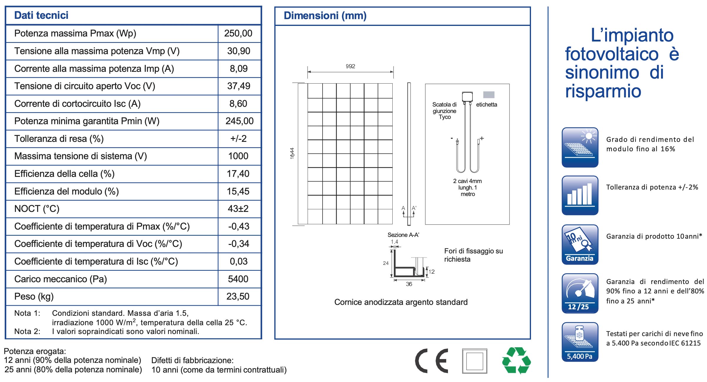 La vita utile di un impianto fotovoltaico è di almeno 25 anni. I moduli, che rappresentano il cuore del sistema (l’elemento più importante sia tecnicamente che economicamente) sono coperti da una garanzia per legge sulla produttività pari all’80% dopo 25 anni.