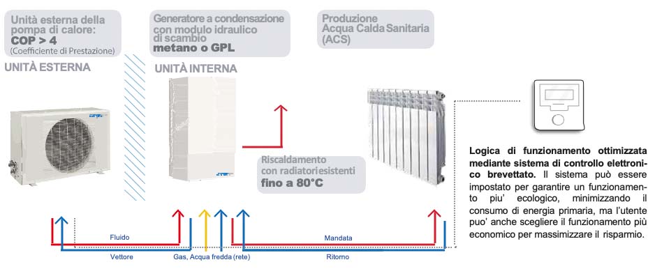 Rendimento in riscaldamento: estremamente più efficiente di una caldaia tradizionale grazie all’azione combinata con la Pompa di Calore (PdC).